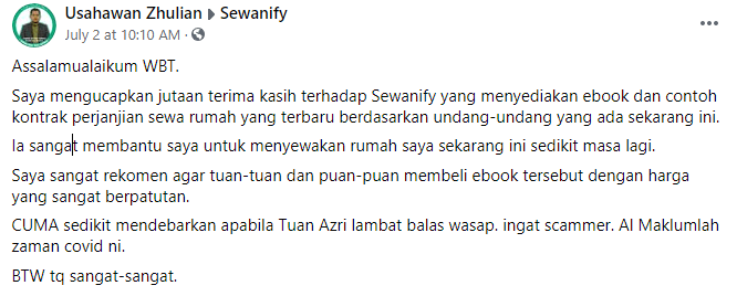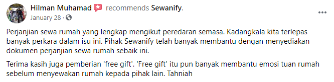 Oleh itu, apa yang kami ingin tekankan di sini adalah pentingnya kefahaman kedua belah pihak tentang tanggungjawab masing-masing melalui perikatan perjanjian yang bersifat holistik. Mampu melindungi hak masing-masing sebagai Tuan Rumah dan Penyewa.